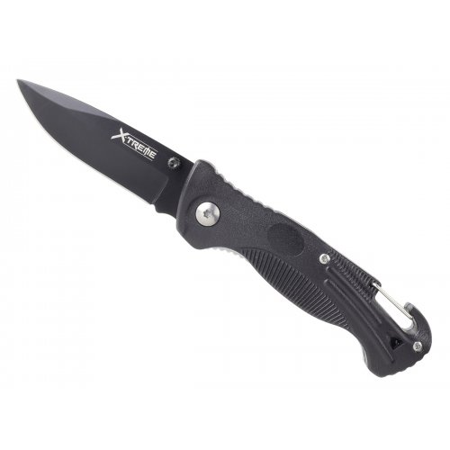 De X-Treme Carabiner een allround outdoor mes met zoals de naam al doet vermoeden een ingebouwde carabiner, Hiermee bevestig je het mes gemakkelijk aan b.v. je rugzak. De Carabiner is eenvoudig één handig open te klappen door zijn Duimstud, vervolgens houdt de linerlock het mes stevig in geopende stand. Het lemmet is glad geschikt voor alle dagelijkse outdoor werkzaamheden. Het heft is gemaakt van een duurzaam synthetisch polymeer. Dit heft maakt het mes niet alleen verrassend licht, maar is ook nog uitgevoerd met een dualtone fluit. Ingebouwd om wanneer nodig een noodsignaal te kunnen geven.